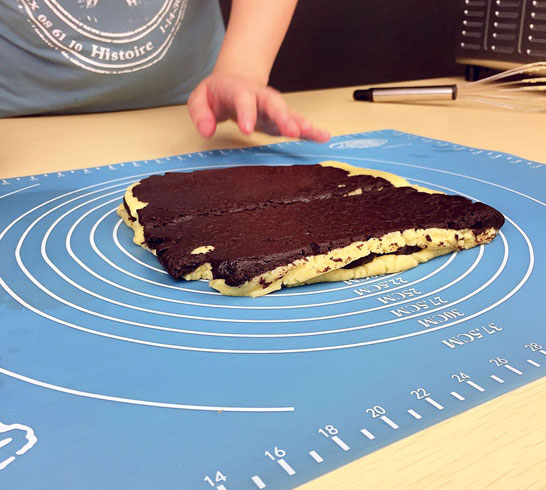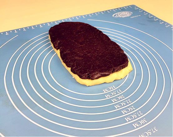 5.將兩種面團搟成大小一致的面塊,疊在一起;(圖5)