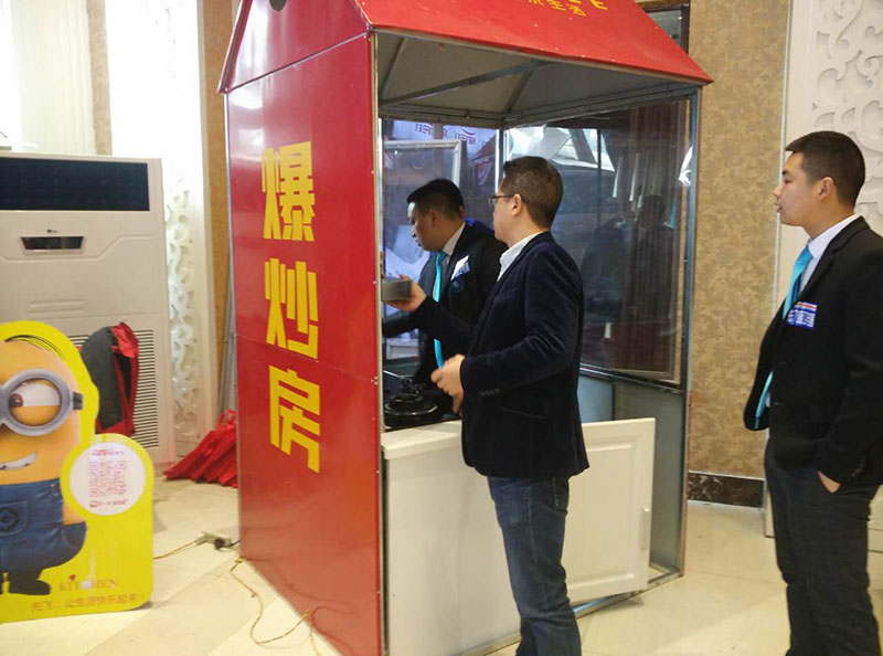先飛時尚的產(chǎn)品掛在白色高檔烤漆背板上,高端大氣上檔次。隨處可見的二維碼,在展廳布置得錯落有致,層次分明。經(jīng)銷商們掏出手機就能輕松了解更多產(chǎn)品,將線上線下無縫對接。蒸霧鍋和爆炒房可以讓大家更為直觀的看到產(chǎn)品的效果。